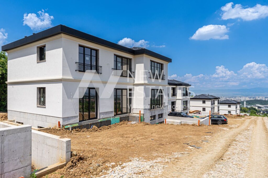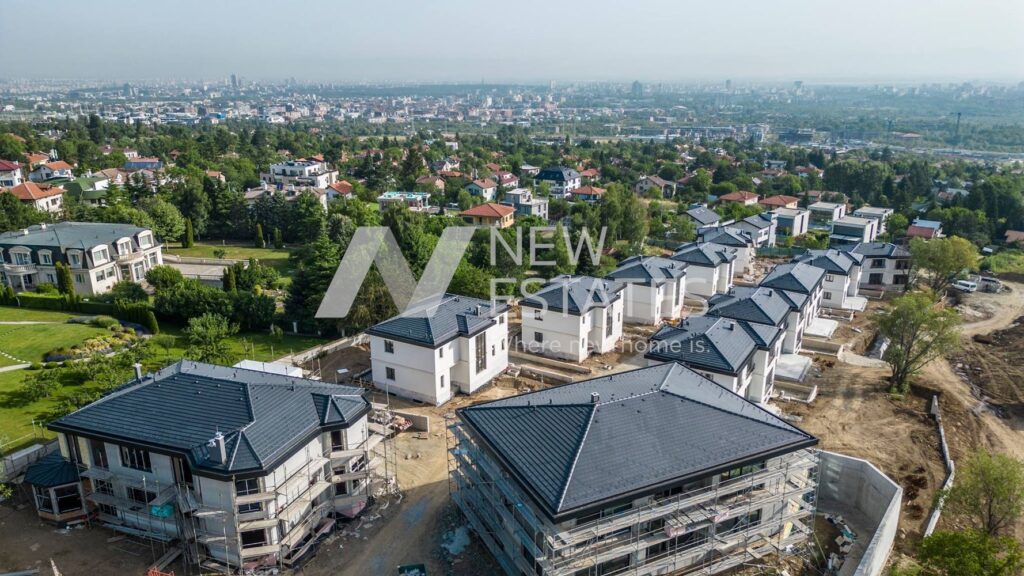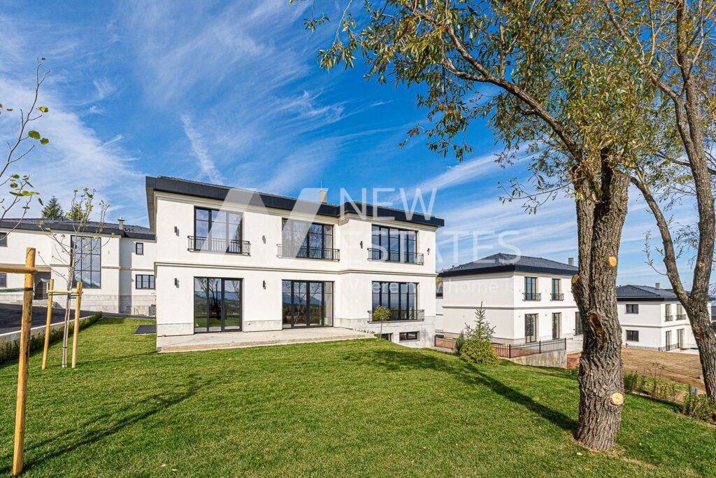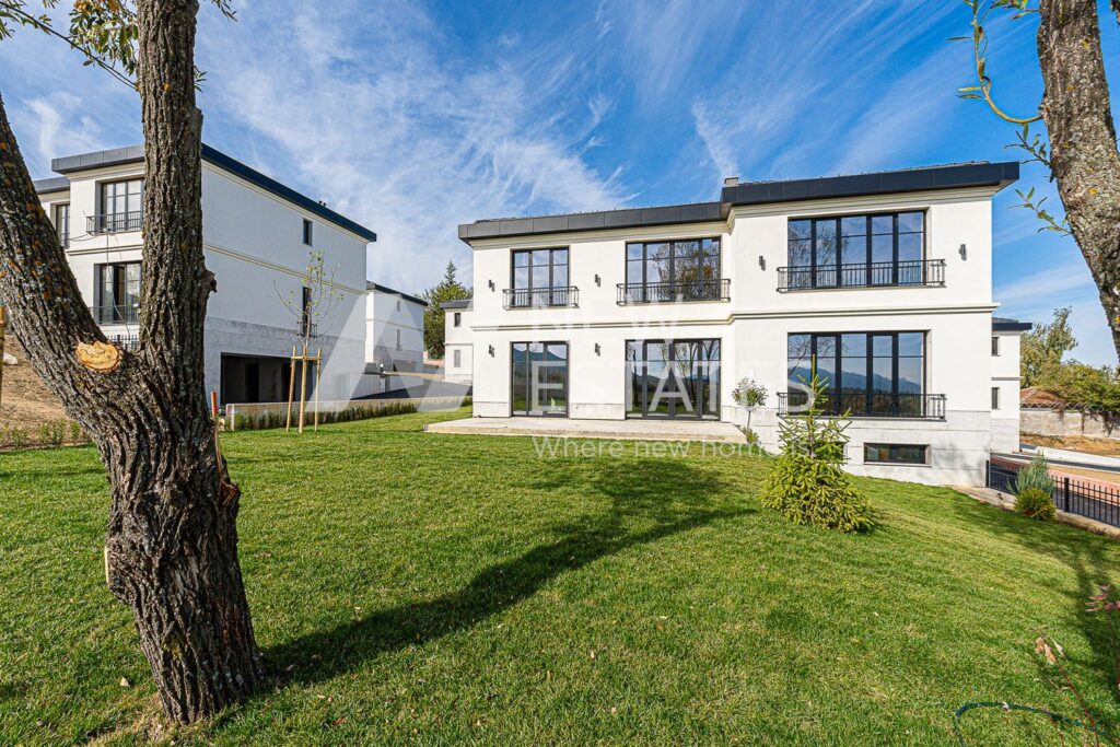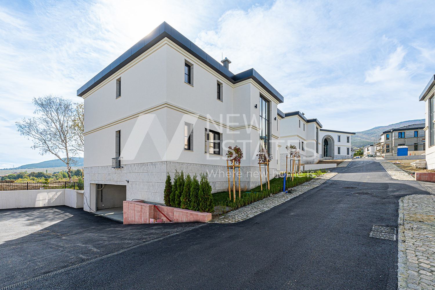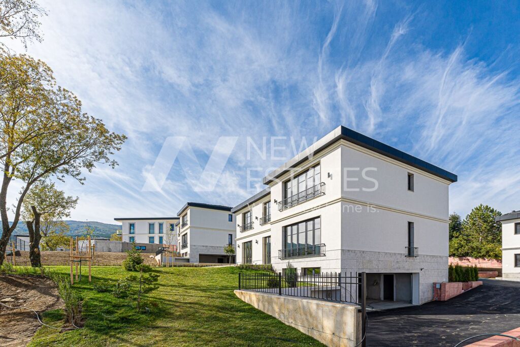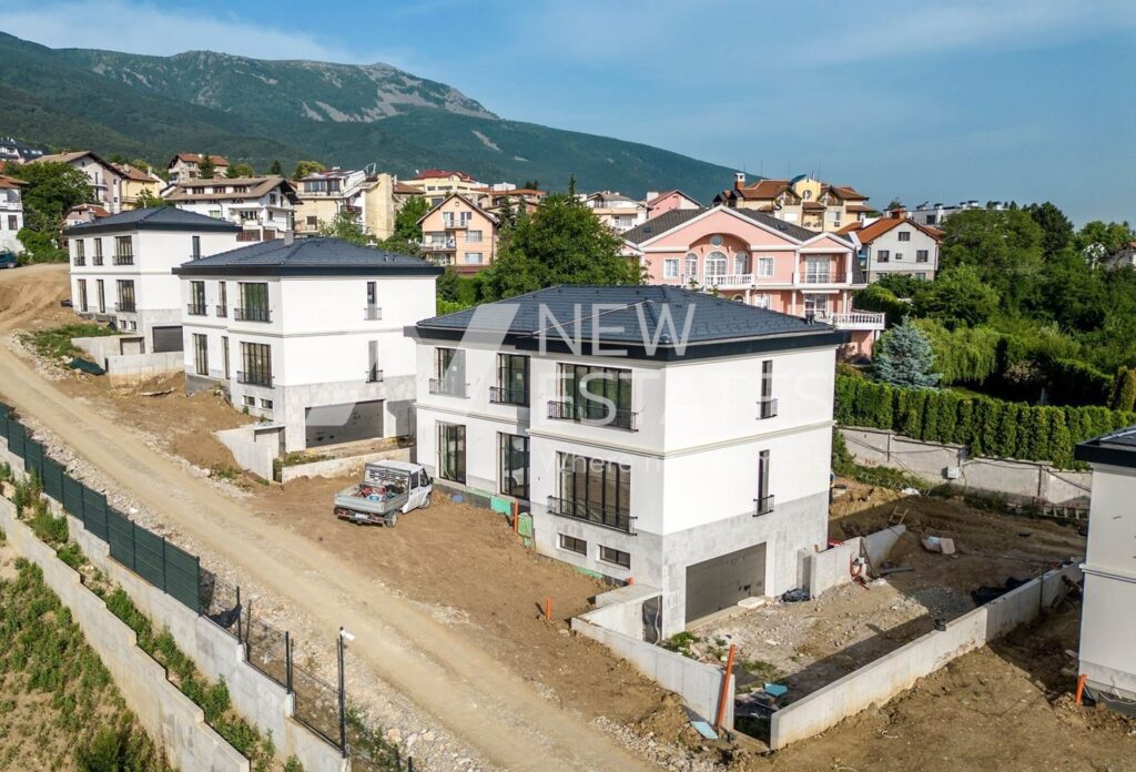 New Estates представя на Вашето внимание един затворен комплекс от най-висок клас, съчетаващ незаменимата комбинация от гледки към Витоша и София. Всяка една от 20-те еднофамилни къщи е ситуирана в самостоятелен парцел от 800 до 1 100 м2, разполага с обща използваема площ между 422 и 497 м2 и е проектирана с 3 до 5 спални (всяка със самостоятелна баня и WC), кабинет, фитнес, два гаража и три паркоместа.