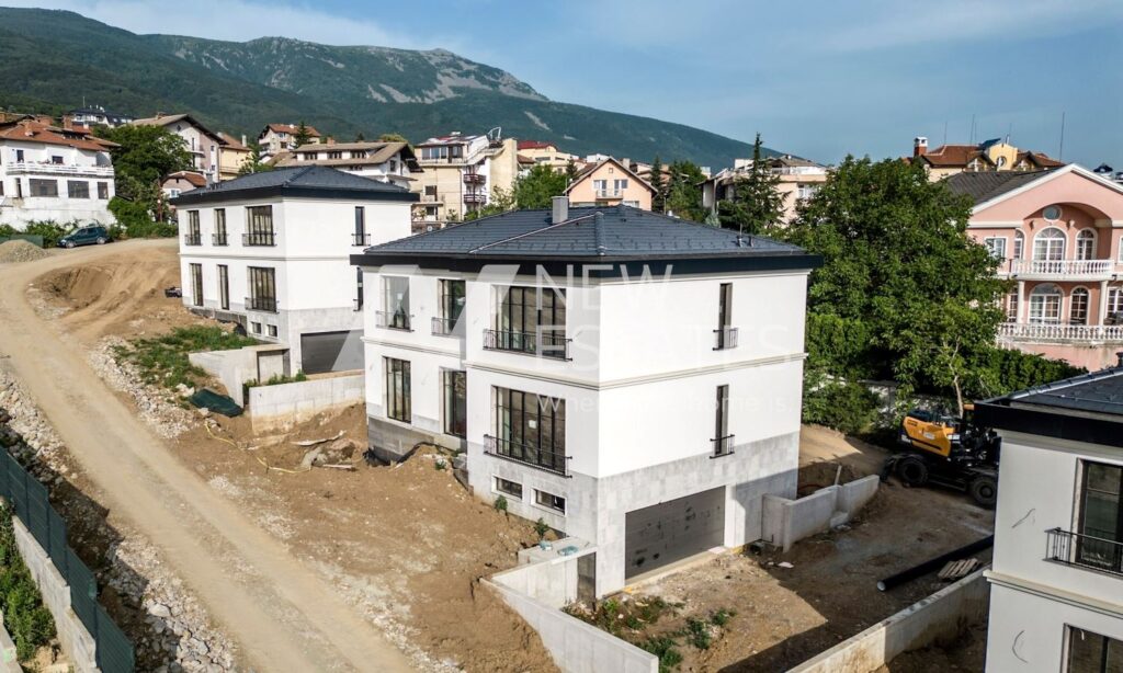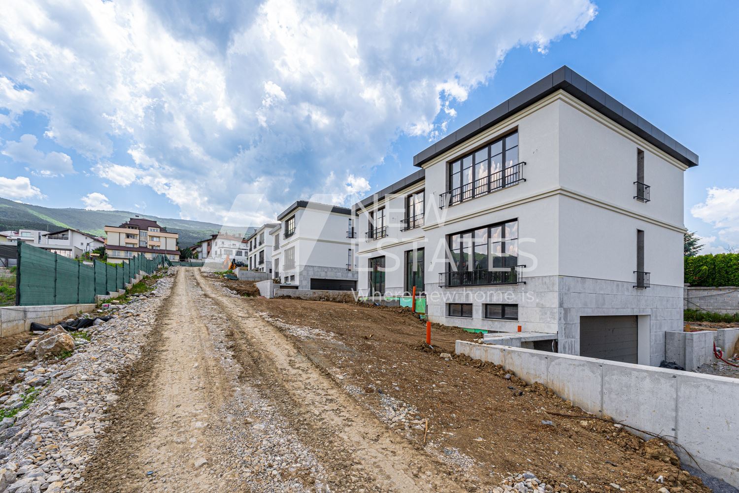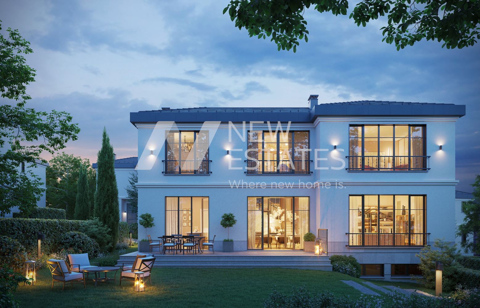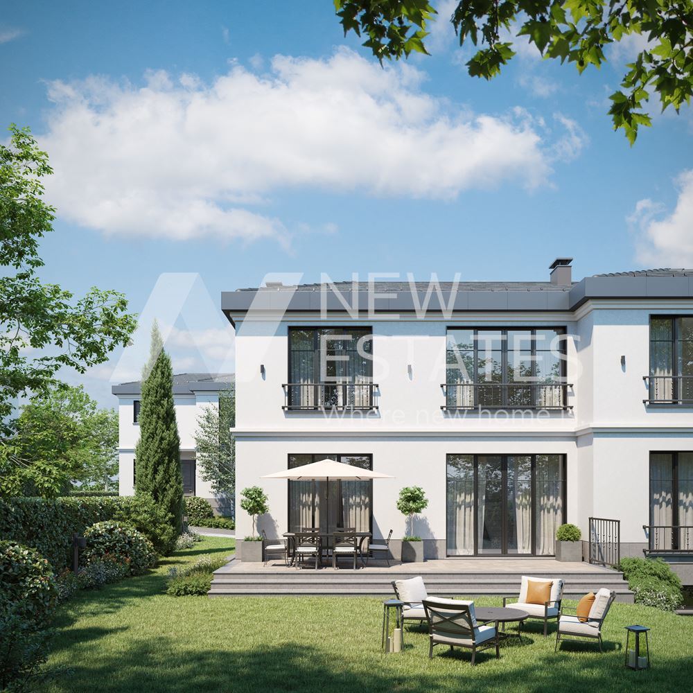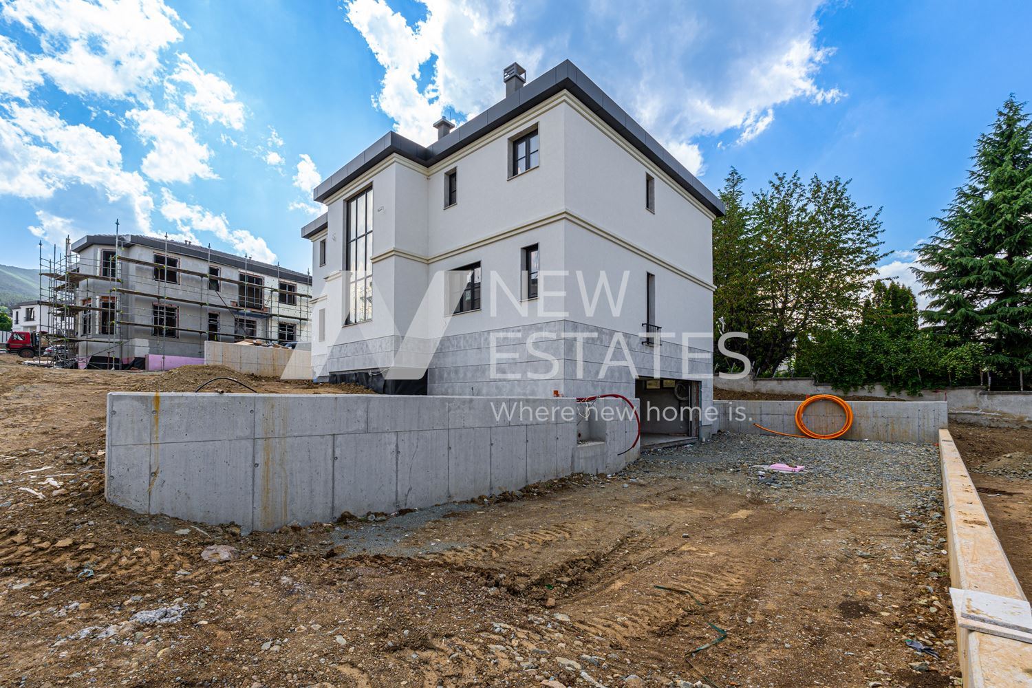 New Estates представя на Вашето внимание един затворен комплекс от най-висок клас, съчетаващ незаменимата комбинация от гледки към Витоша и София. Всяка една от 20-те еднофамилни къщи е ситуирана в самостоятелен парцел от 800 до 1 100 м2, разполага с обща използваема площ между 422 и 497 м2 и е проектирана с 3 до 5 спални (всяка със самостоятелна баня и WC), кабинет, фитнес, два гаража и три паркоместа.