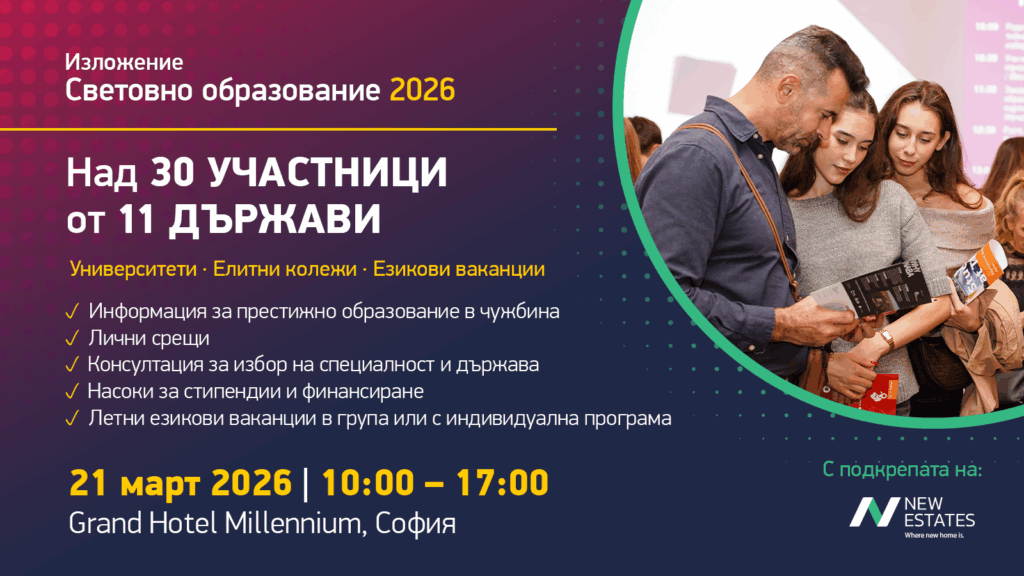 New Estates с гордост застава като партньор на най-големия образователен форум в Югоизточна Европа – изложението “Световно образование“, което ще се проведе на 21 март в София, а след това ще продължи в Пловдив /22 март/, Бургас /23 март/ и Варна /24 март/.